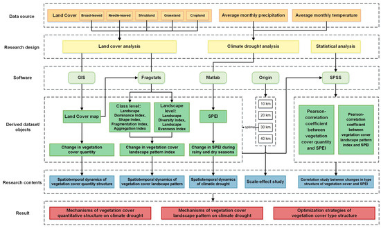 Changes in the quantitative structure of vegetation cover types can impact drought dynamics given variations in water transpiration and retention capacities. Previous studies have examined the response to changes in vegetation cover rate [21,22], with linear regression models correlating vegetation cover with humidity, air temperature, and precipitation [23,24]. Most of the data samples of studies on the response of climatic drought to vegetation are based on vegetation coverage rate and normalized-difference vegetation index (NDVI) [25]. However, it is difficult to accurately reflect the relationship between the quantitative structure of different vegetation cover types and climatic drought, making the spatial response characteristics of drought to changes in different vegetation cover types a research challenge. Second, the study by Han et al. [26] highlights the impact of vegetation cover landscape patterns on the dynamics of dry–wet climate conditions. The different characteristics of vegetation in terms of spatial distribution, such as aggregation, connectivity, and diversity, contribute to dry–wet climate changes. However, it is not clear how regional landscape patterns of different vegetation cover types affect the dry–wet state, the landscape pattern indicators that influence dry–wet dynamics, and the specific influence mechanisms. This study delves into the potential causes and impacts of drought on various unit scales. The objectives were to (1) quantify spatiotemporal drought changes and analyze alterations in the quantitative structure and landscape pattern of vegetation cover types, (2) identify key indicators of vegetation cover types and landscape patterns that stably affect climate and drought, and (3) uncover the influence mechanism through which changes in the quantitative structure and landscape patterns of different vegetation cover types impact climatic drought, to propose strategies to regulate the dry–wet environments and reduce drought risk. Overall, this study not only provides insights into the relationships among quantitative structure, landscape pattern of vegetation cover, and drought dynamics, but also lays a foundation for adjusting the type of structure of vegetation cover to mitigate drought effects.