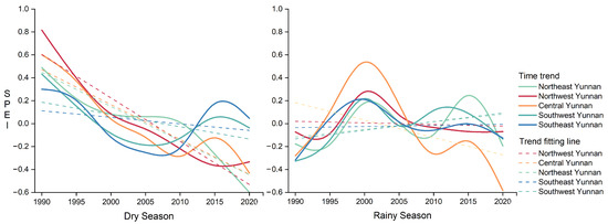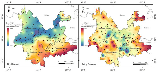 Kriging Interpolation [56] of the SPEI values from 125 Meteorological Stations, Figure 4 maps the spatial distribution of monthly SPEI variation in 1992–2020 to reflect climatic drought changes. In dry seasons, the value of the SPEI change generally exhibited a gradual transition from positive in the southern part to negative in the northern part, displaying a negative correlation with latitude. There was a transition from wetting to aridification conditions, where southeast Yunnan and southwest Yunnan mostly experienced a trend towards humidification, while the northern regions from Central Yunnan were progressively arid. Owing to the wet climate and topography, local areas in northeast Yunnan bordering Sichuan and Guizhou to the east exhibited a humidification trend. In comparison, during rainy seasons, there was a notable aridification trend in most parts of central Yunnan, southeastern northwest Yunnan, and western southeast Yunnan. Central Yunnan served as the epicenter of aridification, spreading outward in all directions before gradually slowing and transitioning to humidification. Overall, the climatic drought patterns during the rainy and dry seasons in Yunnan exhibited significant spatiotemporal heterogeneity. Spatial differences have been attributed to factors such as topography, elevation, atmospheric circulation, and human activities [57].