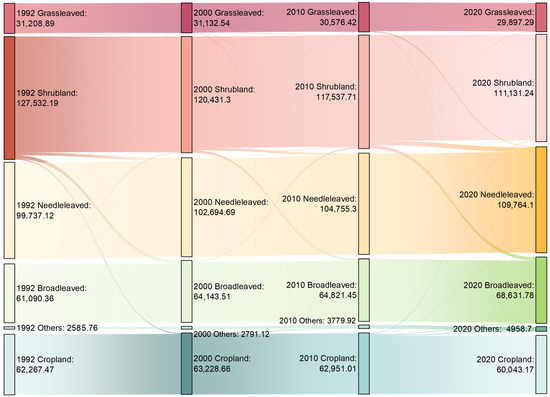The vegetation cover type transfer matrix (Table 3) and Sankey diagram (Figure 5) were obtained by processing the data of five vegetation cover types from 1992 to 2020 in Yunnan. The total area of the five vegetation cover types changed from 381,836 km2 in 1992 to 379,463 km2 in 2020, remaining largely stable. The three types of vegetation cover experienced a decrease in area, with shrublands decreasing the most, followed by croplands and grasslands. Two types of vegetation showed an increasing trend, with needle-leaved forests experiencing the largest increase, followed by broad-leaved forests. Overall, the area dominated by shrublands witnessed the fastest decline, with a notable shift towards broad-leaved forests, needle-leaved forests, and other vegetation cover types.