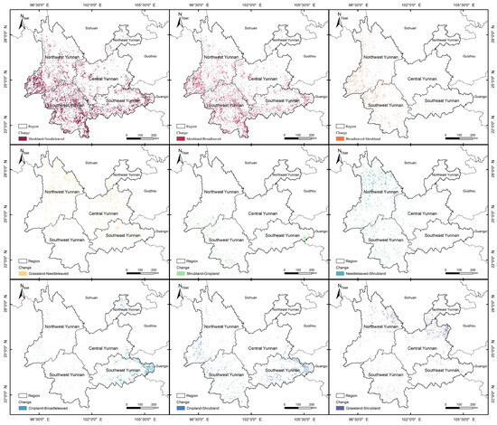 Figure 6 and Figure 7 show the spatial transfer information of different vegetation cover types in Yunnan from 1992 to 2020. The analysis revealed that the highest area of transfer was from shrublands to needle-leaved forests, with an area of 9875.1 km2, which occurred widely in most areas of Yunnan. Following this, the transfer from shrublands to broad-leaved forests was also prominent, with an area of 8929.1 km2. The transfer between these two scenarios was primarily in tropical and subtropical areas such as southwest Yunnan, southeast Yunnan, and southern northwest Yunnan. Three other vegetation cover transformations exceeded 1000 km2. The first involved the conversion of broad-leaved forests to shrublands (1890.3 km2), mainly in tropical and subtropical regions like the western part of northwest Yunnan and southwest Yunnan. The second was the shift from grasslands to needle-leaved forests (1068.7 km2), predominantly in northwest Yunnan. The third was the change from shrublands to croplands (1007.9 km2), in the southern regions of northwest Yunnan, southwest, and southeast Yunnan. In addition to these, there are still some relatively atypical vegetation type shifts occurring throughout the province.