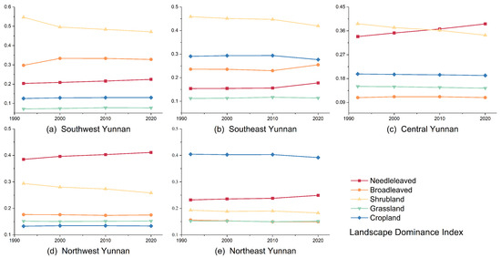 The vegetation LDI reflects the relative importance of a specific vegetation cover type in a region, with a higher index indicating a higher proportion. As shown in Figure 8, shrubland decreased and needle-leaved forests increased in dominance. Broad-leaved forests notably increased in southwest and northwest Yunnan, while remaining stable in other regions. Cropland dominance decreased in southeast and northeast Yunnan but remained stable elsewhere, and grassland showed a generally stable trend across the province.