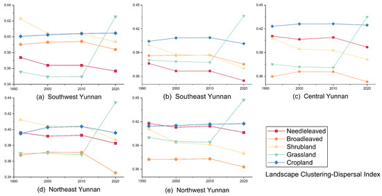 Further analysis of the landscape indices in Yunnan revealed that shrubland dominance decreased significantly in all five regions, while needle-leaved forests underwent a sharp rise, broad-leaved forests increased in southwest and southeast Yunnan, croplands slightly decreased in these regions, and other types remained stable across all regions. Grassland aggregation and distribution increased greatly in all regions, while needle-leaved forests, broad-leaved forests, and shrublands gradually fragmented. Croplands experienced a slight agglomeration in northwest, southwest, and central Yunnan and showed a small fragmentation trend in southeast and northeast Yunnan. Vegetation landscape distribution in southeast and northeast Yunnan was increasingly diversified in species and spatially uniform, whereas in southwest, northwest, and central Yunnan, there was a trend towards landscape diversity reduction and evenness decreased.