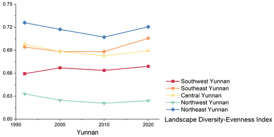 The vegetation LDEI assesses the diversity and abundance of landscapes with the same vegetation cover type within a specific region. A higher vegetation LDEI suggests a greater number of landscapes with the same vegetation cover type and a relatively even spatial distribution. Figure 10 shows that central and southwest Yunnan experienced a slightly fluctuating upward trend in vegetation species richness in the past 30 years, with an increase in the vegetation landscape abundance and a tendency towards spatially uniform distribution. In comparison, northeast Yunnan, northwest Yunnan, and southeast Yunnan exhibited a general downward trend in vegetation landscape diversity, but the index increased in recent years after a decreasing trend in 1992–2010.