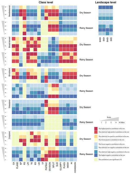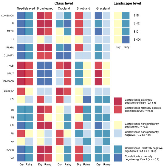 Yunnan was divided into 433 vector units with a grid resolution of 30 km × 30 km, and vegetation landscape pattern indices were calculated at 18 class levels and four landscape levels. A Pearson correlation analysis was performed on the vegetation landscape pattern index and SPEI change during the rainy and dry seasons. As shown in Figure 13, all the correlation coefficients were significant, at a 0.01 level. The landscape pattern indices of the five vegetation cover types exhibited different degrees of correlation with SPEI change. Needle-leaved forests, shrublands, and grasslands showed higher correlation with SPEI change in dry seasons, whereas cropland vegetation showed higher correlations in rainy seasons. Broad-leaved forests exhibited high correlations during both the rainy and dry seasons. Eighteen class-level landscape pattern indicators, except for IJI and PAFRAC, showed significant correlations with SPEI changes for most vegetation cover types. Four landscape-level indicators were significantly and negatively correlated with SPEI changes only in the rainy seasons, indicating distinct seasonal variations in their impacts.