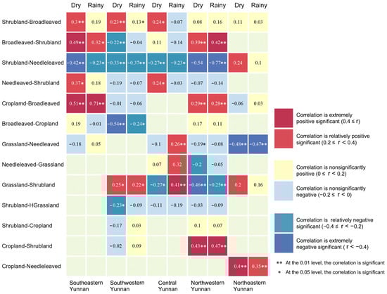 Pearson correlation coefficients between the shifted area of vegetation cover types and SPEI during the rainy and dry seasons were calculated (Figure 12). Samples of the shifted areas of different vegetation cover types in 1992 and 2020 were used to determine their area shift values, while the change in SPEI over the past 30 years was calculated using a 15-year time unit. In the analysis, grid cells with vegetation transfers of 50 km2 or more were selected for analysis because transfers with smaller sample sizes were not statistically representative. The correlation coefficients were categorized into two types and three levels, as shown in the legend to Figure 12.