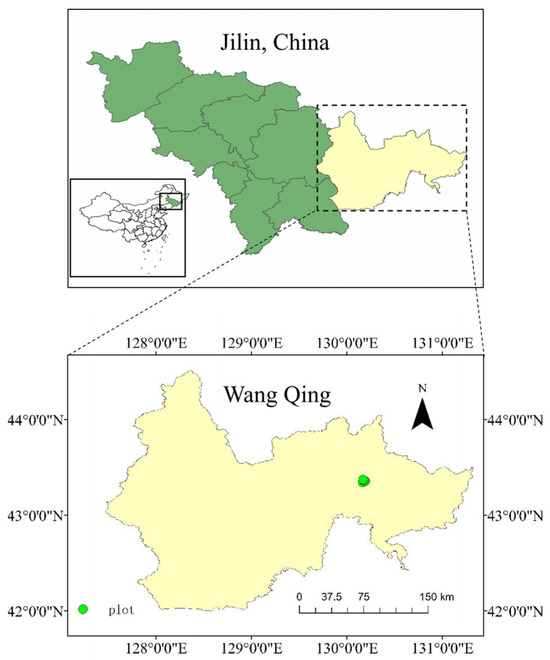 The study area is located in the Jingoulin Experimental Forest Farm in Wangqing County, Jilin Province, with geographical coordinates ranging from 129°56′ E to 130°04′ E and 43°05′ N to 48°40′ N. The forest farm manages a total forest area of 16,286 hectares. Figure 1.