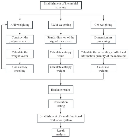 Figure 2 shows the application process of three evaluation methods. Firstly, we follow the principles of scientific nature, systematicity, applicability, and feasibility. Based on the ecological, economic, and social needs of the forest farm, and combined with previous research [62,63,64,76], we divide the multifunctionality of forests into several functions and select appropriate, relevant indicators to construct a hierarchical structure. Then we calculate the weights using the AHP, EWM, and CRITIC methods.