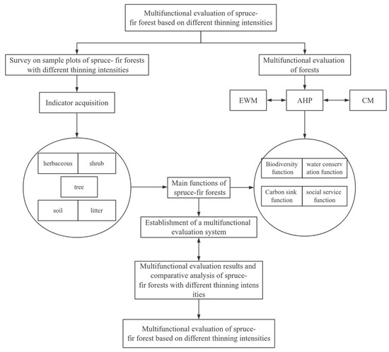 In this study, due to the complexity of the evaluation object (forest multifunctionality), we first used the Analytic Hierarchy Process (AHP) to divide it into several levels and construct the basic structure. Then we used subjective AHP weighting, objective entropy weighting, and CRITIC weighting to obtain the three evaluation results. We observed the differences in the evaluation results of the three methods and tested their consistency. Based on the evaluation results, we analyzed the impact of thinning intensity on the multifunctionality of the forest.