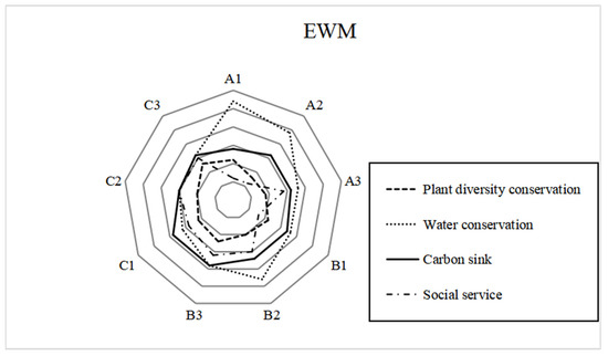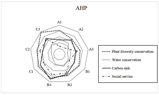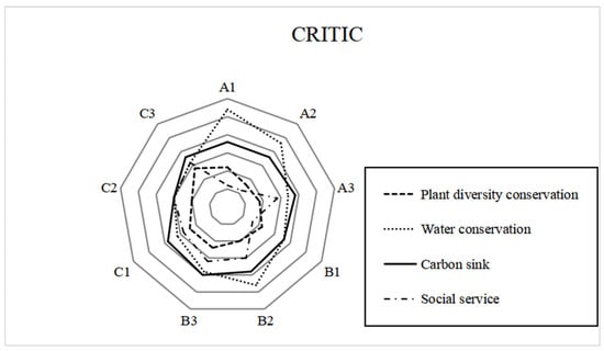 Taking into full consideration the socioeconomic needs (needs of local community or stakeholder) and unique ecological environment of the Jingouling Experimental Forest Farm, and analyzing the survey data as well as referring to previous research [62,63,64], we first use AHP to determine the structure and confirm the dominant functions of spruce–fir forests, including biodiversity conservation, carbon sequestration, water conservation, and social services. Then we selected factors, which closely related to the multifunctional attributes of spruce–fir forests, as evaluation indicators to be included in the evaluation system. Finally, we used different methods (AHP, EWM, and CRITIC) to construct evaluation systems, and we compared the evaluation results and observed the impact of the evaluation methods on the evaluation results.