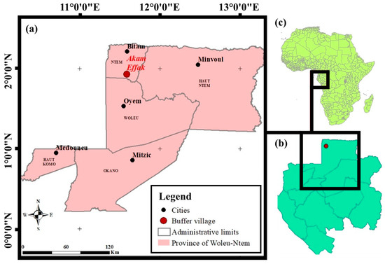 Location of Akam Effak village (a) within the province of Woleu-Ntem (b) in northern Gabon, West Africa (c).