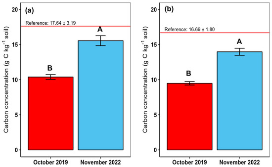 Comparison of soil organic carbon concentrations between October 2019 and November 2022 after 40 months of growth of J. curcas at 0–10 cm (a) and 10–20 cm (b) depths on a tropical soil that has been previously cultivated intensively during 43 years for rubber and cacao production. Means associated with different letters differ significantly from each other at p < 0.10. Vertical bars represent mean standard error. The horizontal red line presents the values of undisturbed natural forest soil used as a reference.