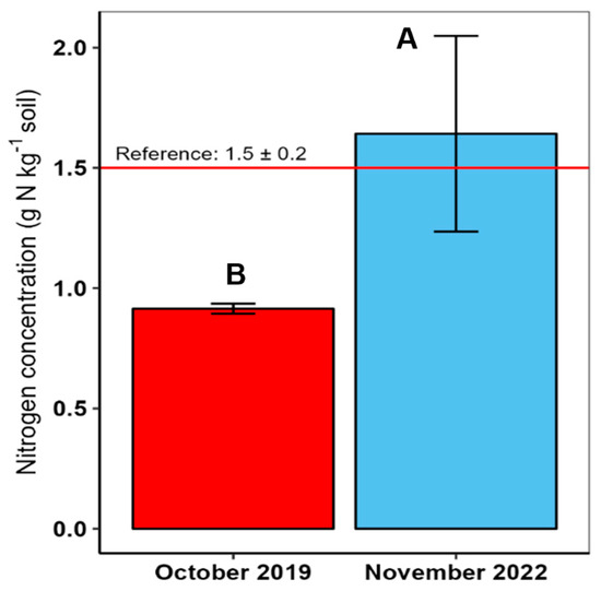 Comparison of total soil nitrogen concentrations between October 2019 and November 2022 after 40 months of growth of J. curcas at 0–10 cm on tropical soil that has been previously cultivated intensively for 43 years for rubber and cacao production. Means associated with different letters differ significantly from each other at p < 0.10. Vertical bars represent mean standard error. The horizontal red line presents the value of undisturbed natural forest soil used as a reference.