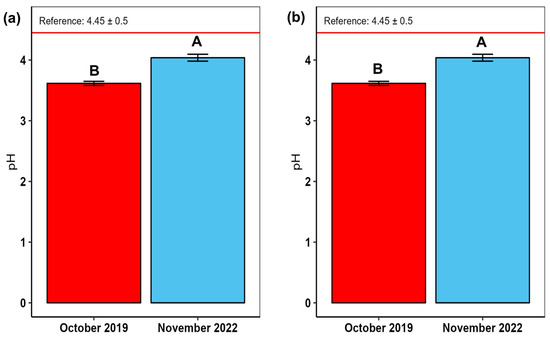 Comparison of soil pH between October 2019 and November 2022 after 40 months of growth of J. curcas at 0–10 cm (a) and 10–20 cm (b) depths on a tropical soil that has been previously cultivated intensively during 43 years for rubber and cacao production. Means associated with different letters differ significantly from each other at p < 0.10. Vertical bars represent mean standard error. The horizontal red line presents the values of undisturbed natural forest soil used as a reference.
