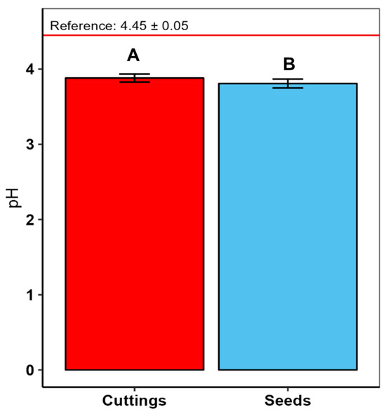 Comparison of soil pH at 10–20 cm depth between the two types of propagation material used to grow J. curcas on tropical soil that has been previously cultivated intensively for 43 years for rubber and cacao production. Means associated with different letters differ significantly from each other at p < 0.10. Vertical bars represent mean standard error. The horizontal red line presents the values of undisturbed natural forest soil used as a reference.