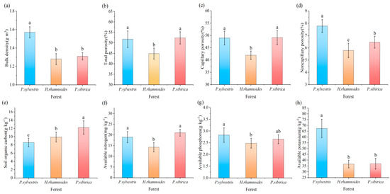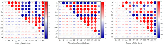 - Significant differences in herb diversity, soil physicochemical properties, and their relationships were observed among different forests (p < 0.05). Some variations existed in soil bulk density, porosity, available nitrogen, available phosphorus, available potassium, and plant diversity index between the P. sylvestris forest and P. sibirica forest, with a similar change trend. The interaction between herbaceous diversity and soil physicochemical properties under various artificial forests influenced ecosystem succession.