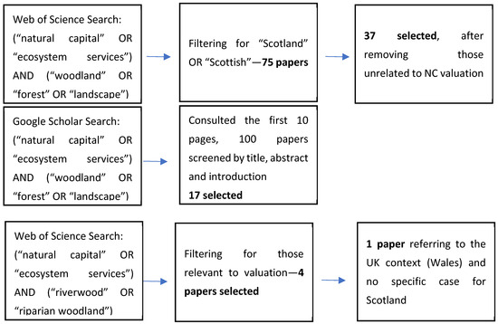 We screened papers referring to the Scottish territory (75 in total), considering any form of economic or social valuation, and providing implications for decision-making. Papers were discriminated based on auditing the title, abstract and introduction of each paper, leading to the selection of 37 titles. We also conducted a Google Scholar search using the same search strings and explored the first 10 pages (100 hits were consulted). Excluding duplications and papers not addressing valuation approaches clearly in the title, keywords and abstract, 17 papers were selected. In addition, a further search was carried out to consider recent research affecting the implementation of natural capital approaches in riparian woodland using the following string: (“natural capital” OR “ecosystem services”) AND (“riparian woodland” OR “riverwood”). Nine papers were found and four were included in the database. Of these studies, only one was carried out in the UK (Wales), showing a shortage of research in this area. Figure 1 reports the flow chart of the selected papers.
