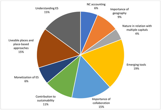 Figure 3 reports the classification of papers based on the typologies and roles of NC approaches, as proposed in Table 1. It is observable that several approaches spanning from economic valuation to non-monetary, participatory, and mixed methods have been proposed to classify NC initiatives in the UK. Applying this categorisation to the screened literature, it is possible to observe that there is not any particular dominant area. Only a limited number of studies address economic valuation (as also emerged from the international review) using accounting procedures or cost benefit analysis (CBA). The majority of articles address a broader set of values using participatory approaches, eliciting non-anthropocentric values. Place-based initiatives are very well addressed (15%), along with the analysis and understanding of ecosystem services (15%) and the formulation of new solutions (15%). Each of these categories is second only to the category “Emerging tools” (19%).