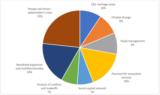 The theme of multifunctionality in forests is also important, as explored by 19% of the papers selected in our review. Also significant is the contribution of approaches based on solutions that may facilitate the protection of forests through the implementation of payment for ecosystem services (16%). Other themes, such as the role of stakeholder networking (7%), overcoming conflicts and trade-offs (7%), and the role of forests in reducing the effects of flooding and countering the effects of climate change, are less explored (9%). Examples addressing the economics of climate change mitigation by afforestation in the UK and the necessity of reconciling carbon sequestration forest policy initiatives with sustainable development were provided by Nijnik et al. [50]. Their results show empirical evidence that: (i) in certain cases (e.g., for certain species, management regimes, locations, etc.), afforestation projects in the UK may offer a relatively low-cost option for carbon sequestration; (ii) there is a strong case for forestry in Scotland to contribute to climate mitigation; (iii) woodland expansion is likely to be competitive with other means of removing carbon from the atmosphere, and (iv) it is important to place carbon forestry in the general context of rural land use in Scotland, where significant policy reforms are being observed.