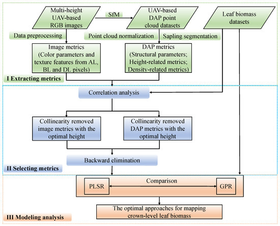 In this study, we constructed regression models employing PLSR and GPR for estimating leaf biomass of Ginkgo saplings based on optimal image metrics (including color feature parameters and texture feature parameters derived from all leaf, the 50% brightest leaf, and the 50% darkest leaf pixels of RGB images), as well as DAP metrics (encompassing structural, height-related, and density-related metrics). In particular, the selection of optimal image metrics and DAP metrics was initially conducted using the backward elimination strategy in both PLSR and GPR models. Subsequently, the implementation of PLSR and GPR models was carried out using the selected optimal metrics. All analyses were conducted in the MATLAB R2017b environment (MathWorks, Inc., Natick, MA, USA). A detailed overview of these methodologies is presented below.