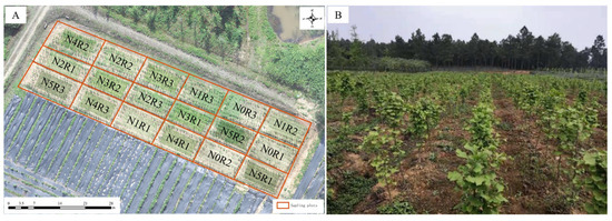 Experimental design of nitrogen application treatments for Ginkgo saplings. (A) The drone aerial photography and (B) situ photos in the experimental area.