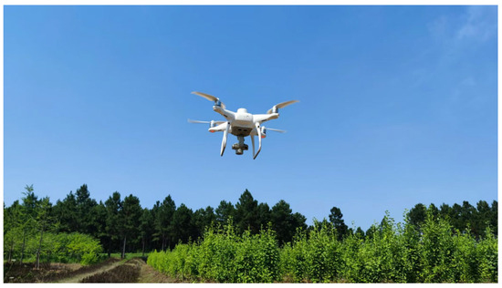 The RGB image data for this study were collected between 10:00 and 10:30 am on 19 September 2021, under sunny weather conditions. RGB images of Ginkgo sapling canopies were captured using a DJI Phantom 4 RTK UAV (SZ DJI Technology Co., Shenzhen, China), equipped with an RGB digital camera (model FC6310R) featuring a resolution of 20 megapixels (5472 × 3648 pixels) (Figure 3). In accordance with the existing literature (such as Zhai et al. [11]) and the resolution requirements for images captured at varying altitudes, gird size should be no more than one-fifth of the crown width of saplings, which is the recommended setting in the individual tree segmentation [26]. Accordingly, the flight of a UAV was conducted at altitudes of 30 m (flight duration of 6 min), 60 m (flight duration of 5 min), and 90 m (flight duration of 4 min), yielding spatial resolutions of 0.7 cm, 1.5 cm, and 2.3 cm for the acquired RGB images, with the flight direction and side overlap rates being both set to 80%. This strategy also ensured that all flights could be completed within a half-hour timeframe, capitalizing on relatively consistent sunlight conditions. In this study, DJI TERRA software (SZ DJI Technology Co., Shenzhen, China) was employed for 2D image mosaicking, providing detailed visual representations of the sampled saplings, while this software cannot be used for visual interpretation. To complement this, ArcGIS software (ESRI, Redlands, CA, USA) was used for the visual interpretation and delineation of individual canopy contours for sampled saplings (for extracting image and DAP metrics, as well as leaf biomass modeling), as well as all saplings within three typical plots (for comparing the tree top detection performance) under N0, N2, and N4 nitrogen level treatments. An area of interest was generated based on the extent of the canopy contours. To further mitigate the adverse effects of soil background on leaf biomass estimations within the area of interest in 2D images, soil pixels (such as those at the edges of the area of interest or captured through the sapling canopy gaps) were removed using threshold segmentation (ExG > 65) through ENVI+IDL software (EXELIS, Boulder, CO, USA) programming. This process facilitated the identification of the 50% darkest pure leaf pixels (the 50% of the sapling crown image pixels with relatively low RGB brightness) and the 50% brightest pure leaf pixels (the 50% of the sapling crown image pixels with relatively high RGB brightness). RGB values and subsequent color feature parameter and texture feature values were extracted for further analysis.