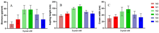 The results illustrated that leaf biomass, height, and crown width of Ginkgo saplings increased initially from N0 levels to the peak at N2~N3 levels and then subsequently declined with higher nitrogen fertilizer applications (Figure 4). Specifically, leaf biomass reached a maximum of 77.59 g/plant, height peaked at 185.00 cm, and crown width attained a maximum of 79 cm at the N2 or N3 levels.