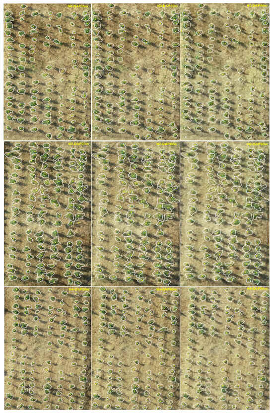 Table 6 presents the tree top detection performance using multi-height DAP point cloud datasets (30 m, 60 m, and 90m) across three typical plots under low (N0), medium (N2), and high (N4) nitrogen treatments. The results indicated that 30 m DAP datasets obtained the best performance (CD = 99.05%~100.00%; CE = 0.94%~2.86%), followed by the 60 m DAP datasets (CD = 92.45%~94.29%; CE = 1.89%~3.81%), and then the 90 m DAP datasets (CD = 77.14%~87.62%; CE = 2.86%~4.76%). Regarding nitrogen fertilizer levels (Figure 5), the N2 plot (CD = 87.62%~99.25%; CE = 2.86%) generally outperformed both the N0 plot (CD = 77.14%~100.00%; CE = 1.90%~4.76%) and N4 plot (CD = 81.13%~100.00%; CE = 0.94~4.72%). In terms of the tree top detection for the sampled saplings, using 30 m DAP datasets successfully identified all sampled samplings (CD = 100.00%), whereas the 60 m DAP datasets (CD = 98.15%) and the 90 m DAP datasets (CD = 83.33%) missed 1~9 sampled saplings.