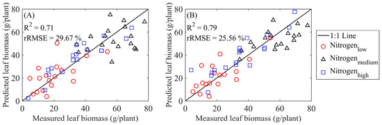 The scatterplots for PLSR (A) and GPR (B) models with the image metrics of 60 m height and the DAP metrics of 30 m height. Nitrogenlow, Nitrogenmedium, and Nitrogenhigh represent the low (N0~N1), medium (N2~N3), and high (N4~N5) nitrogen fertilizer treatments, respectively.