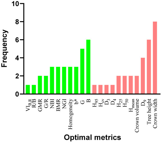 The frequency of the optimal metrics selected in the PLSR and GPR models for the estimation of Ginkgo leaf biomass. The green and red color bars represent optimal image metrics and DAP metrics, respectively.