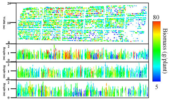 The horizontal distribution and vertical profile of the estimated leaf biomass of Ginkgo saplings based on GPR models with the optimal 60 m height image metrics and 30 m height DAP metrics at the landscape level. The upper, medium, and bottom vertical profiles are extracted from six plots within the upper, medium, and bottom rows in the horizontal distribution map, respectively.