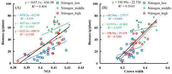 The linear relationships between leaf biomass of Ginkgo saplings and an image metric of NGI (A) or a DAP metric of Crown width (B).