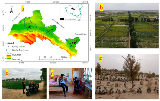 A map of the study area. (a): The geographic location of the study area. (b): Farmland shelter forest. (c): Windbreak and sand fixation forest. (d,e): Interviewing farmers.