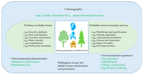 We used the conditional value method, which involves evaluating the value of a certain environmental object, investigating and inquiring about peoples’ willingness to pay for the protection of a certain resource or the improvement of environmental benefits and then obtaining the value of this environmental object [43,44]. We included only the willingness to pay and not the willingness to be compensated to examine farmers’ willingness to donate to shelter forest construction and protection and allowed respondents to choose the payment interval and specific amount. Before setting the payment interval, we fully understood the income and willingness of the farmers. Because the income of farmers in the sandy area is limited and too high of an amount will make farmers resent this behavior, we chose to set the interval based on CNY 100, including an unwillingness to pay, 1–10, 11–50, 51–100, and more than 100. The purpose of this approach was to determine the farmers’ motivation to construct and protect forests based on the actual situation rather than a compensatory measure with a financial purpose. For the influencing factors of perception, we mainly incorporated demographic factors, environmental characteristics, and respondents’ social experiences. The specific perception indicators and impact factors are presented through a framework diagram in Figure 2.