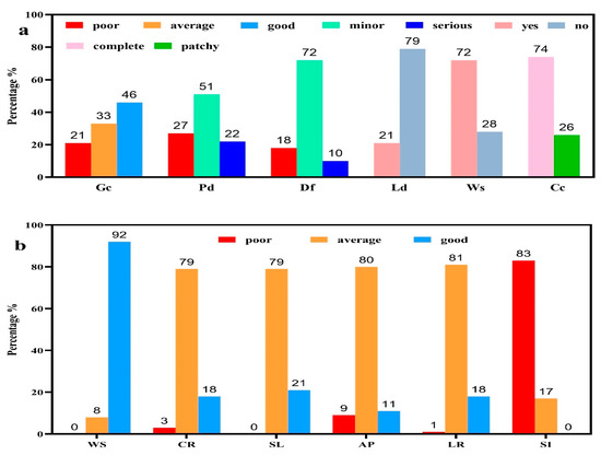 Farmers’ perception of the shelter forest. Note: (a) status, (b) ecosystem service, Gc: growth condition, Pd: peats and diseases, Df: destruction farmland, Ld: livestock destruction, Ws: water security, Cc: completeness condition; WS: windbreak and sand fixation, CR: climate regulation, SL: sense of locality, AP: agricultural production, LR: leisure and recreation, SI: soil improvement.