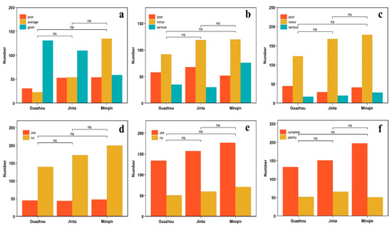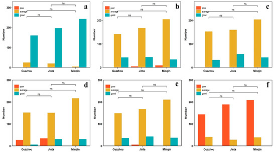 Regional divergence in farmers’ perception of shelter forest status. Note: (a): growth condition, (b): peats and diseases, (c): destruction farmland, (d): livestock destruction, (e): water security, (f): completeness condition, ns: no significant.