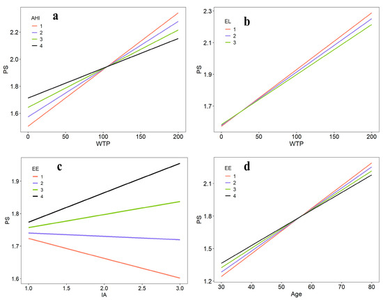 Interaction factors influencing farmers’ perception of shelter forest. Note: WTP: willingness to pay, PS: perception score, AHI: annual household income, EL: education level, EE: environmental experience, IA: interviewed area. (a) is the perception score moderated by willingness to pay and annual household income; (b) is the perception score moderated by willingness to pay and education level; (c) is the perception score moderated by interviewed area and environmental experience; (d) is the perception score moderated by age and environmental experience; A larger number on the horizontal axis of c indicates that the interviewed area is farther west. The 1, 2, 3, and 4 in the legend (c,d) represents no experience, afforestation, village construction, and agroforestry training.