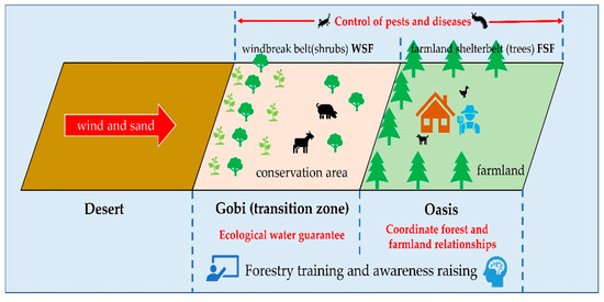 The Hexi Corridor is in an arid desert area with frequent wind and sand disasters, and the construction of shelter forests is an important measure to ensure local economic and social development. It will be necessary to address issues such as pests and diseases and the destruction of farmland, which are the key to the sustainable growth of shelter forests. Hence, we have provided some suggestions about future shelter forest management plans in windy and desert areas (Figure 7). We suggest the planting of shrubs to act as windbreak forests near the desert and trees to form farmland shelter belts near the residential areas. It will be necessary to control the pests and diseases reported by farmers through the use of fertilizers and pesticides and to coordinate the relationship between forest and farmland to ensure the ecological use of water to cope with soil improvement.