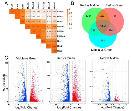 In this study, three biological replicates were set for green, middle, and red samples, and the correlation of gene expression levels among the samples was an important indicator to test the reliability of the experiment and the reasonableness of the sample selection. In addition to testing the repeatability of the biological experiment, it was used to evaluate the reliability of differentially expressed genes and assist in the screening of abnormal samples. We used the Pearson correlation coefficient to represent the correlation of gene expression levels between samples (Figure 1A). The closer the correlation coefficient is to 1, the higher the similarity of expression patterns between samples. In general, a correlation coefficient between 0.8 and 1 is a strong correlation, and if the correlation coefficient between biological duplicate samples is lower than 0.8, it means that the correlation between the samples is low. Through the correlation analysis of the samples, it was found that the coefficient of biological repetition between the green, middle, and red samples was between 0.8760 and 0.9958, and there was a strong correlation between the samples, indicating that the samples had good repeatability and consistency and could be used for subsequent analysis.