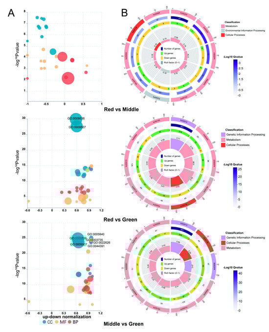 There were 126 DEGs specific to the Red vs. Middle comparison group, 2485 DEGs specific to the Red vs. Green comparison group, and 454 DEGs specific to the Middle vs. Green comparison group (Figure 1B). In addition, 1233 duplicate DEGs were common to all three.