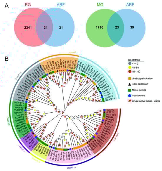 Venn diagrams and phylogenetic tree of the ARF gene family. (A) Genes annotated as ARFs with different groups of Venn diagrams. RG was a comparison group of red and green leaves. MG was a comparison group of middle and green leaves. (B) Phylogenetic tree in Acer truncatum, Vitis vinifera, Oryza sativa subsp. indica, Malus pumila, and Arabidopsis thalian. Members of five species are marked with symbols of different colors. The black triangle represents the AtARFs.