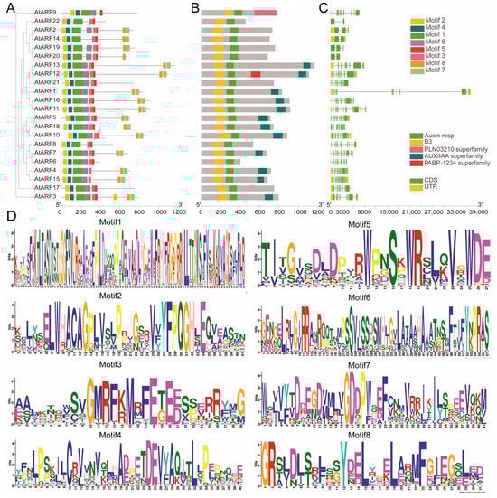 Phylogenetic tree, gene structure, distribution, and the sequences of conserved motifs for the AtARF proteins. (A) The tree was constructed of 22 chrysanthemum AtARF proteins using the neighbor-joining method. The right portion shows the distribution of conserved motifs in AtARF proteins. (B) Conservative sequence of AtARF proteins. (C) Exon–intron regions of AtARFs. (D) ARF protein motifs as derived by MEME analysis.