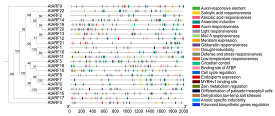 The cis-acting elements of the promoter sequences (2000 bp) of 22 AtARFs. The points on the straight line in the figure indicate the position of the cis-acting element on the 2000 bp sequence upstream of the transcript.
