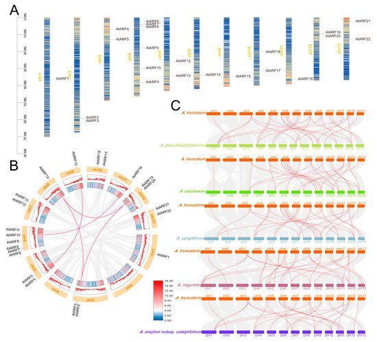 Location and colinearity of AtARFs. (A) Chromosomal location of AtARF transcription factors. AtARFs generating tandem duplicates were connected using red lines. (B) Intraspecific covariance in metazoan maple. The gene density heatmap, gene density fold plot, and gene location on chromosomes are indicated from within to within. (C) Interspecific covariance of ARFs.