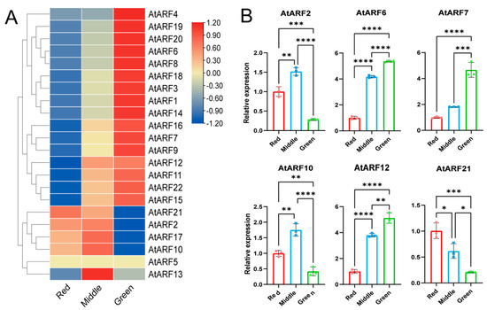 Different transcriptional expression levels of AtARFs. (A) The expression of AtARFs was febrile. Red and blue represent higher and lower transcriptional expression abundance, respectively. The yellow square indicates no transcriptional expression. (B) The expression patterns of AtARFs in different leaf colors from qRT-PCR (* p < 0.05, ** p < 0.01, *** p < 0.001 and **** p < 0.0001).