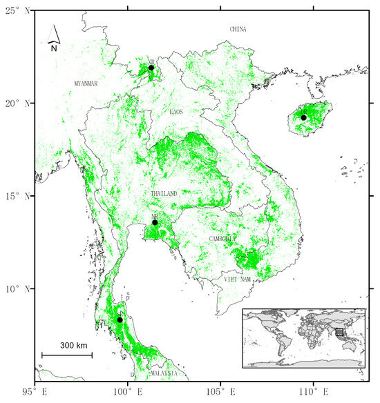 In this study, data from flux observation stations in China and Thailand were selected, and their locations are shown in Figure 1. The green areas on the map indicate where the rubber tree forests are located [38,39]. Two are located in China (Hainan Island and Xishuangbanna), and two are located in Thailand (Chachoengsao and Nakhon Si Thammarat) (Table 1).