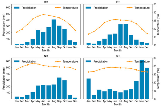 Figure 2 illustrates the monthly variations in precipitation and temperature across four sites: DR, XR, NR, and SR. Regarding temperature, the two stations in the Chinese region, DR and XR, have high summer temperatures and low winter temperatures due to their proximity to the northern edge of the tropics. XR has the highest temperature in June, reaching 25.7 °C, and the lowest in January, at only 16.7 °C. Similarly, DR records the highest temperature in June at 28.6 °C and the lowest in January at 17.9 °C. The two stations in Thailand, NR and SR, show little temperature variation throughout the year, fluctuating between 25 and 32 °C. In terms of precipitation, the annual average rainfall and distribution for the XR, NR, and DR stations are similar, ranging from 1600 to 2000 mm, with specific values of 1601 mm, 1821 mm, and 1914 mm, respectively. The SR station has the highest annual average rainfall, reaching 2924 mm. The XR, NR, and DR stations receive more rainfall in the summer and autumn (June to November), generally above 200 mm, while the winter and spring seasons see less rainfall, typically below 100 mm. It is worth noting that there are slight differences during the transitional months. The SR station experiences the most rainfall from October to January, generally above 300 mm, with other months having relatively balanced rainfall, exceeding 100 mm.