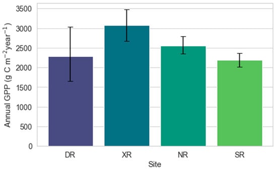 Figure 3 shows the annual GPP values for four different locations. The XR station in Southwest China has the highest annual GPP, reaching 3075.5 g C m−2 year−1. The DR station on Hainan Island, China, and the two stations in Thailand (NR and SR) have similar annual GPP values. The DR station has an average annual GPP of 2280.5 g C m−2 year−1. The value for the NR station is slightly higher at 2558.4 g C m−2 year−1, and the SR station has the lowest at 2189.5 g C m−2 year−1. In terms of variation, DR and XR show greater fluctuations, while NR and SR have smaller variations.