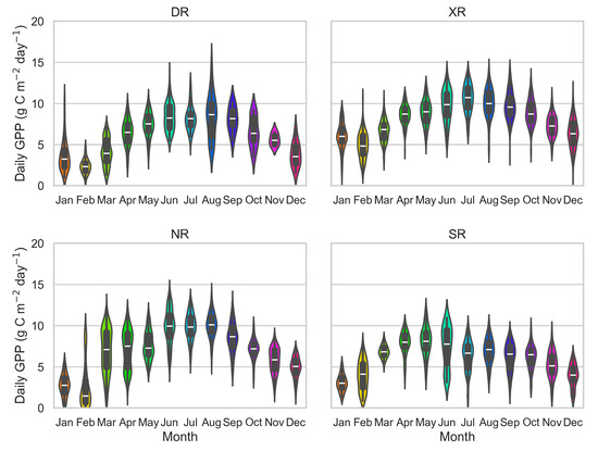 The violin plot in Figure 4 shows the monthly variations in daily GPP for the four sites DR, XR, NR, and SR. At all sites, daily GPP values typically exhibit a pronounced seasonal trend, with lower values in winter, usually reaching their minimum in January or February, gradually increasing, peaking in summer or autumn, and then declining. The daily GPP at the XR site is relatively stable throughout the year, with monthly GPP values being relatively concentrated, and the average daily GPP in February is also above 5 g C m−2 year−1. The highest average daily GPP in July exceeds 10 g C m−2 year−1. The daily GPP variation in the same month for the other three sites is greater, with the highest average daily GPP generally below 10 g C m−2 year−1, and the lowest months below 5 g C m−2 year−1. Among all the sites, the monthly average daily GPP fluctuates the most at DR, while it is the most stable at XR.