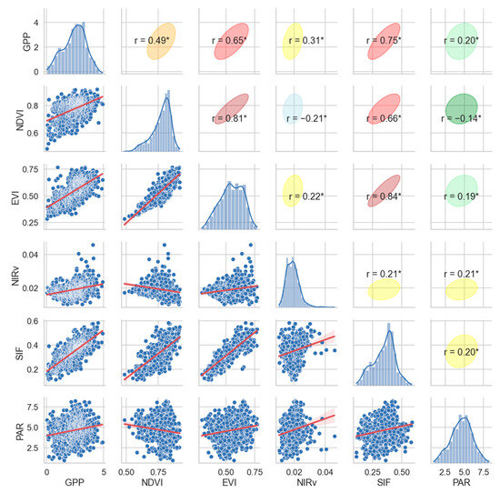 Scatter matrix plot of the distribution and correlation between GPP and VI indices. Significant correlations are indicated with * (p < 0.05). In the upper-right plots, the colors of the ellipses represent the strength of the correlations. In the lower-left plots, the red line indicates the regression line, and the shaded area represents the 95% confidence intervals.
