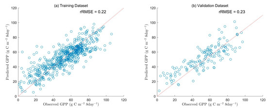 Here, is the observed value, is the predicted value of the metric, and is the average of the observed value. The rRMSE measures the proportion of deviation between observed and true values. The smaller the rRMSE value is, the smaller the deviation between the predicted and true values, indicating higher model accuracy. Additionally, we compared the annual GPP predicted by the model with the flux observations to further validate the model’s accuracy.